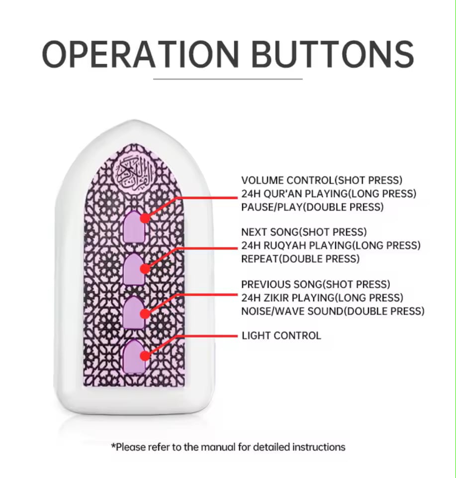 শুধু সকেটে প্লাগ দিন, প্লে করুন—ব্যস! এটি স্বয়ংক্রিয়ভাবে এক সূরা/যিকির থেকে আরেকটিতে চলে যাবে এবং নিরবচ্ছিন্নভাবে বাজতে থাকবে।
